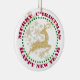 A faux glitter gold reindeer leaps against silvery gold snowflakes falling all around him.The image is surrounded by a green dotted circular frame and the circular text in red Merry Christmas Happy New Year. Cute! The image and text are placed on a white background. The back of the ornament has the same red and green circular frame around your custom text. A pretty Holiday ornament to give as a gift or keep for yourself!