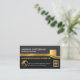At the top of the card stands your prestigious name and job title. Just below the roof line is the business name followed by a gold hammer logo you can use. Beside the logo are the contact details and a slogan caption to publicize your services ; Change the caption remarks to the slogan to suit your own needs.