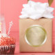 Round label/sticker in a rich gold with rose marble background plus a shiny gold frame.. You can click on "Customize it!" if you'd like to add text or a photo.