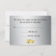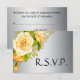 A contemporary yellow and silver wedding RSVP with a traditional touch: a gorgeous bunch of gold roses in the top left corner. In the background there is a shiny silver metallic base. The reverse also has a tiny yellow rose bouquet at the bottom.