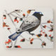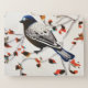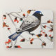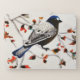 Winter has been ushered into a forest. A bird perches on a branch, inquisitively inspecting his wintertime surroundings.