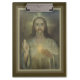 Beautiful Golden designer clipboard of the Sacred Heart of Jesus. The artist had great difficulty painting the eyes. After several attempts, she blocked out the eyes and retired to bed in prayer. When she awoke in the morning, the Sacred Heart's eyes had been miraculously painted in.