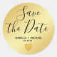 Very hip and modern typography design. Save the Date is written in a large trendy font. The wedding couple names is written in a simple font along with the wedding date. A picture gold foil heart is placed at the bottom. All text is easily customized.