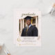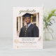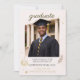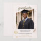 Academic portrait theme with warm gold accents on a soft cream background, featuring a centered graduate photo framed by subtle confetti details and small scholarly icons. Script and serif typography pair with a clean layout suited for college commencement announcements and campus celebration gatherings.