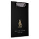 Chic personalized clipboard for your salon or hairstyling business features two lines of custom text in classic white lettering, on a rich black background adorned with a pair of flower-embellished scissors in faux gold foil. Design repeats on reverse side.