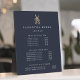 Elegant plaque with easel displays your salon services or price list in classic white lettering on a rich navy blue background adorned with a floral scissors logo in faux gold foil. Includes three customizable headings and body text fields. To adjust layout, enter your text and then use the Customize function to change positioning and font sizes.
