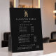 Elegant plaque with easel displays your salon services or price list in classic white lettering on a rich black background adorned with a floral scissors logo in faux gold foil. Includes three customizable headings and body text fields. To adjust layout, enter your text and then use the Customize function to change positioning and font sizes.