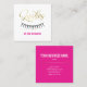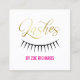 Stylish square business card for a lash artist in an eye catching design with "lashes" in a golden, swirly script, a minimal lash design and bold magenta as the accent color.