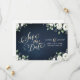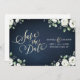 Modern faux gold save the date calligraphy and watercolor white floral eucalyptus greenery on dark navy blue background, elegant and stylish, great for greenery rustic wedding, botanical garden wedding, boho floral wedding in summer and winter.