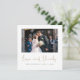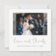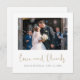 This simply chic photo wedding thank you card template features a crisp modern look and a distinctive square shape. We've given this minimalist design a splash of panache with 'love and thanks' below the photo in an elegant gold tone called California Gold in a flowing script in all lower case that lends a warm, familiar accent. This part of the design cannot be altered. You can easily edit the other text not just to show your own details but also suit your taste, picking your favorite colors and fonts. The names and date text on the front are a very dark gray that's in fact mostly black, and we've chosen dark gray for the text on the back. We've put some sample text on the back for you to replace with your own message. But please don't feel restricted by this. If you prefer delete our sample text and keep the back totally blank so that you can write a handwritten note on each card instead, you can do that. Or you might want to replace our text with your own message of gratitude and your own closing and then hand sign your names when you receive the cards. While our sample text is all upper case, you can of course change this, as well as changing the font and text color when you edit our text and add your own. Just please be sure in any case to delete our sample text on both sides of the card, as well as our sample photo! The default background on both is transparent so that the color of the paper will simply serve as the base tone. You can change this by picking a color for one or both sides in the editing tools if you'd like. Use the intuitive design tools, your favorite photo and your inspiration and make it uniquely yours! And please browse our wedding thank you collection for a version of this card with the 'thank you' script in black, as well as other simply chic modern wedding thank you cards.