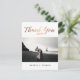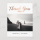 Stylish wedding thank you postcard template featuring a photo on the front with the text "Thank You" in a modern script font in faux shiny gold. There is a small foliage illustration under the text in faux gold as well. Custom thank you message and returning address on the back of the card. Elegant and modern design.