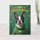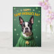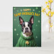 This card shows a well-groomed Boston Terrier centered against a deep emerald-green background, dressed like it’s ready for a cozy night in with a close friend 💚. Its black-and-white coat looks like a tiny tuxedo, and it meets your gaze with big brown eyes that feel steady and affectionate. The forest-green cable-knit turtleneck hugs its neck and shoulders, adding warmth and a snug, cuddly look. Pinned to the sweater is a shiny gold shamrock that catches the light like a little keepsake from someone special ☘️. Across the top, the words “HAPPY SAINT PATRICK’S DAY” sit in gold lettering with a slight tilt, standing out clearly against the green. The setting stays simple but layered, with shamrock shapes scattered behind the dog, some crisp and some softly out of focus like they’re floating in the distance. The overall scene feels like a tender portrait where the dog’s calm posture and direct eye contact suggest quiet companionship. Faint shamrocks drift across the background in mixed sizes, creating depth behind the centered terrier and the gold headline.