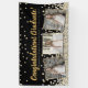 Elegant custom graduation banner design featuring gold and silver confetti over a black background, modern script typography with the words "Congratulations Graduate" (in gold), your name and custom year (in silver) plus three of your favorite photos framed in metallic gold foil.