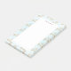 Sticky notes with a festive holiday repeating pattern of chic gold snowflakes drawn with elegant crystal shapes. A frosty light blue background. A white rectangle layered over top to write upon.