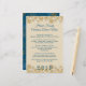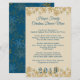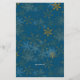 Christmas dinner menu template printed on affordable, flyer paper. Top and bottom border of gold snowflakes with dark blue text. Create a title, add the year, and list the menu choices for a special holiday feast on Christmas Day or Christmas Eve. Reverse has the same snowflake design on dark blue.