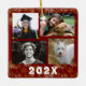 Gold snowflakes on dark red photo collage ornament. Upload four photos to show on the front of square ornaments with year in bold white text. Customize both sides- or choose the square single-sided ornament with a metal frame which will show the front (photos and year) only. Choose only the square size option - ornament will print as you see it!