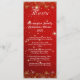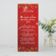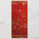 Red, family Christmas dinner menu template with gold snowflakes and twinkling stars. Customize white text on tall, flat cards, with family name and year. Include the name of the cook / baker next to each food for a more personal presentation.
