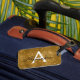 Gold Twinkle Sparkle Shimmer Monogram Name and Initial Luggage Tag. This bag tag is perfect for Back to School, Work, or Traveling. The Glitter and Gold Luggage Tag is also a great Wedding Favor for Bridesmaids.