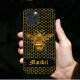 Design features hand drawn sparkling gold Queen bee on a golden hexagon beehive. Personalized with elegant gold script typography; making it a unique an elegant black gold accessory.