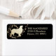 This pretty return address label features a gold silhouette Australian Shepherd Dog image in front of a swirl of gold stars. The image is placed on a dramatic black background. Your custom text is in light gold at the right of the image.