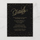 Tiny, glittery gold stars sparkle in confetti clouds around the edge of this beautiful gold and black wedding invitation enclosure card, with a gold glitter effect script reading, "Details". Fancy, chic and enchanting all at once. Perfect for a fabulous affair. Original artwork by Colleen Michele. Please note, there is not a real gold glitter or gold leaf effect on the stars and script; no actual glitter, gold leaf or metallic ink will be used in this invitation.