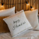 Beautiful throw pillow with Happy Hanukkah in decorative writing.