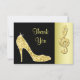 Women's personalized, elegant custom Thank You cards for birthday parties with glitz and glamour. Woman's beautiful gold and black thank you card with a stunning glamorous printed image rhinestones, glitter, sequins, diamonds bling jewels sparkle high heels stilettos fashion shoe, and glittery gold treble cleft on a black and gold background. Chic, classy, cute, girly, modern thank you cards for birthday's or any other event in trendy, fashionable colors / colours. These groovy, fancy, stylish, sophisticated, pretty, girlie cards are decorated / printed on both sides. The back of this thank you card has a space for you to write your own personal thank you message. PLEASE NOTE: All products on Zazzle have flat printed images.