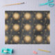 This celestial design showcases golden suns and scepters on a black background. Perfect for decoupage artwork, paper crafts, or gift wrapping.