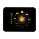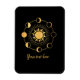 Center sun graphic surrounded by a circle of moon phases in gold on black background. Add your name, company, brand or other special message to personalize in gold colored modern script text.