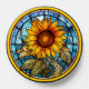 This colorful phone PopSocket features a bright gold sunflower with green leaves. The flower image is set against a faux stained glass window. Colors used include blue, gold, orange, and green.