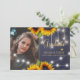 Elegant floral graduation announcement card featuring sunflowers bouquets and strings of twinkle lights over a dark midnight navy blue chalkboard background,. +++++++++ Easy to personalize with your name, school and class.