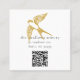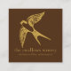 Modern square business card features gold vintage swallows bird illustration on dark brown background with contemporary text on front, and customizable QR code for your website or social media on back.