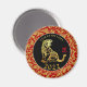 Greeting round refrigerator magnet with golden traditional Chinese paper-cut of a Tiger into a black circle + red Chinese Tiger ideogram + yellow 2022 and "Year of the Tiger" on decorated background in dark red and yellow. Perfect for Chinese New Year of the Tiger 2022 or birthday (people born in Tiger Year).