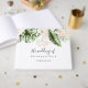 This gold tropical foliage floral wedding guest book is perfect for a rustic wedding. The design features hand-painted watercolor gold and tropical green foliage with elegant blush flowers.
