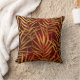 This throw pillow features a pattern of gold tropical style leaves on a rich burgundy red gradient background that almost seems to glow. Both sides of the pillow have the same pattern.