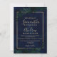 A modern, chic and elegant gold typography Floral green Christmas winter wedding party invitation with hand painted green watercolor leaf foliage on navy blue watercolor.