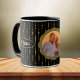 A scalloped gold frame at the middle shows off your favorite photographs on this elegant Golden Wedding Anniversary keepsake mug. It's easy to upload your own photograph. On each side of the photograph is your custom text within a gold framed black oval label. Everything is placed on a black background with gold bead curtain decoration. A nice keepsake gift for that special couple.
