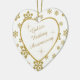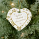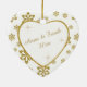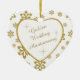 This is an elegant ornament to celebrate a couple's 50th Wedding Anniversary, either at the time of the celebration or for Christmas. It features a white heart framed in gold faux glitter on a matching gold glitter snowflake on white background. Inside the white heart is your text in matching gold, plus twinkling gold star images. The text is fully customizable, so you may make it say whatever you'd like. There is a 2nd text field on the back, which has the same gold snowflake border and inside image. This is a special family keepsake gift that will be treasured forever. *Please note - the image is printed, and the ornament does not contain glitter.*