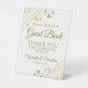 This beautiful wedding tabletop guest book sign is a wonderful welcome for your guests, and will help you direct them to sign your guest book to leave a lasting memory of your sepcial day. It features a simple yet elegant gold & white design with script lettering and lacy golden faux foil curls and swirls in the corners. The sign reads: Please Sign Our Guestbook Thank You for Celebrating with us! There is room for your names and the wedding date below.