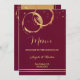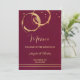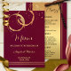 An elegant winery or vineyard wedding (or Thanksgiving dinner) menu template card featuring gold and rose gold intersecting wine ring stains and sparkles on a burgundy marsala background. Also beautiful for a restaurant to use for special occasions.