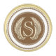 Brown, round background with white and brown border with white lattice trim. Large pale golden wings left and right of initial. Template monogram for you to customize.