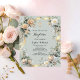 A sage green background. Decorated with white and yellow florals and a golden ribbon. A golden cross. Personalize and add a name and details.