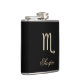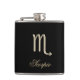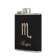 Gold Zodiac Sign Scorpio on Black Flask. A handy pocket flask with a Gold astrological symbol for zodiac sign Scorpio the Scorpion with gold trim, and the word Scorpio written in metallic gold script. Keep your favorite Scorpio happy and help them celebrate!