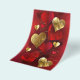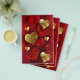 Vertical composition of red and gold, textured valentines made of foil and brocade on red background. Valentines day decorations.
