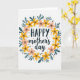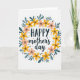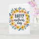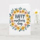 This Mother's Day card features a circular wreath of stylized flowers and leaves on a white background, wrapping the message in a gentle, affectionate embrace ❤️. The word “HAPPY” sits at the top in a dark, thick type style, while “mother’s day” appears just below in a flowing, cursive-like lettering for a softer, tender contrast. The wreath mixes sunny yellow blooms with blush-peach flowers, suggesting the kind of warm closeness you’d share in a long hug or a sweet, knowing glance 🌼. Teal, elongated leaves weave between the blossoms, giving the ring a calm, steady rhythm that feels like supportive companionship. Small black dots are scattered around the arrangement like confetti, adding a light, friendly energy without crowding the center. Tiny golden, starburst-like marks sparkle between petals and leaves, hinting at little moments of care shared throughout the day. The flowers form an even circle around the centered text, with yellow and peach petals alternating among teal leaves and scattered black dots and gold starbursts.
