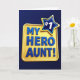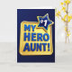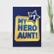 This card features a deep navy blue background that makes the center design stand out like a spotlight. In the middle sits a golden-yellow rectangle with rounded corners, glowing warmly like a little award plaque. Across that yellow shape, the words “MY HERO AUNT!” are set in all caps in a rich blue, with thick raised lettering that casts soft shadows and feels proudly confident ❤️. The glossy highlights on the letters give them a smooth, almost polished look, like fresh paint catching the light. Up in the upper right, a five-point star overlaps the plaque, adding a lively “you’re the one I look up to” kind of energy. The star has a deep blue fill with a bright yellow outline, and a raised white “#1” sits in the center like a badge of affection 🌼. The lighting makes the plaque and star look slightly lifted off the dark background, with subtle shading along the edges and under the text.