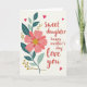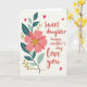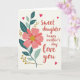 This card features a large floral illustration on the left, led by one big blossom with broad coral-pink petals that leans into the open space like a gentle hug ❤️. At its center sits a speckled golden circle that catches the eye, surrounded by leafy sprays in deep teal and soft sage with thin white outlines. Slender stems with small golden berry clusters weave around the flower, adding a soft sparkle against the light creamy background. On the right side, the message is arranged in three lines: “Sweet daughter” at the top, “happy mother’s day” beneath it, and “love you” at the bottom, all set in a flowing, hand-drawn lettering style in a dark tone for contrast. A few small red hearts are scattered nearby, giving the layout a quiet, affectionate rhythm like shared glances between close family 👩. The warm pinks and cool greens balance each other, keeping the design calm while still eye-catching. Tiny gold accents and red hearts sit around the lettering, with the hearts appearing mostly near the right side of the card.