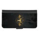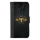 Artistically drawn, symmetrical, composition of black and gold, bird wings, golden, bird skull decorated with gilded pattern on dark, textured background.Gothic style