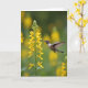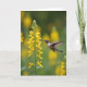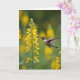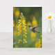This card features a tiny hummingbird hovering beside a tall stalk of yellow flowers, its wings shown as a soft blur as it leans in with a slender beak. The bird has a dark head, a white chest, and a faint green sheen along its back and tail, catching the light in a gentle, affectionate way ❤️. The flower stalk rises in a sturdy green line, dotted with clustered golden blossoms that feel like little offerings as the bird draws close. The background fades into a soft wash of greens with round, glowing yellow highlights, making the close interaction feel quietly romantic, like a shared secret in a garden. Near the top, a simple Mother’s Day greeting sits in light-colored lettering, and a smaller line of text rests near the bottom in a warm yellow tone 🌼. The overall scene stays focused on the tender “almost-touch” between beak and bloom, as if both are leaning toward each other. Fine details show in the petals and stamens along the flower clusters, while the bird’s tiny dark eye is sharply defined. Behind them, the out-of-focus backdrop forms scattered yellow circles against muted green.