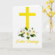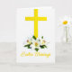 Designed with a bright golden-yellow upright symbol centered on a pure white background, this Easter card keeps the focus simple and striking. At the base of the symbol sits a small cluster of three white blossoms, their curved petals opening like gentle gestures shared between close friends 🌷. Each flower shows tiny orange-red stamens at the center, adding a warm spark that feels like a soft, affectionate glance. Fresh green leaves tuck around the blooms, giving the arrangement a natural, caring touch without crowding the space. Near the bottom of the card, a short Easter greeting appears in flowing lettering, set in the same golden-yellow as the central symbol so the message feels tied to the image. The lighting is bright and even, with a faint glow along the edges that makes the yellow and white contrast feel airy and calm 🐰. Three white flowers with orange-red centers rest at the foot of the golden-yellow symbol, framed by scattered green leaves on the white field.